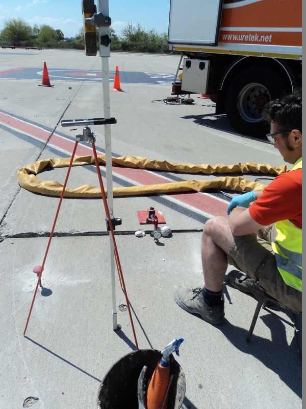 Devido à infiltração de água e ao efeito " bombagem " produzido pelo elevado peso dos aviões estacionados nesta zona, ocorreram assentamentos, transmitindo estas deformações para as lajes e produzindo fissuras e desníveis consideráveis na zona de contacto das lajes. Estas patologias puseram em causa a utilização segura destas pistas. A intervenção tornou-se necessária para consolidar o terreno sob o pavimento e restaurá-lo à sua posição original.